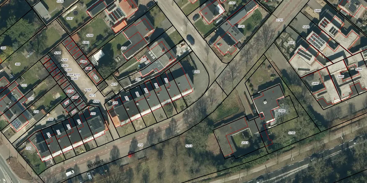 Het perceel waarop Boskant 1 staat heeft een oppervlakte van 385 m². Dit is een groot perceel. De perceeloppervlakte wordt geregistreerd door het Kadaster. Gedetailleerde informatie over de maten van dit perceel kunt u vinden in het rapport Kadastrale kaart met maatvoering van Boskant 1.