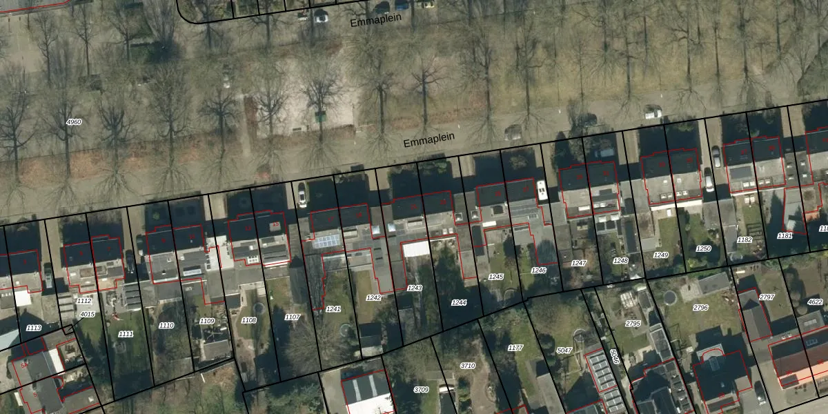 Het perceel waarop Emmaplein 21 staat heeft een oppervlakte van 433 m². Dit is een groot perceel. De perceeloppervlakte wordt geregistreerd door het Kadaster. Gedetailleerde informatie over de maten van dit perceel kunt u vinden in het rapport Kadastrale kaart met maatvoering van Emmaplein 21.