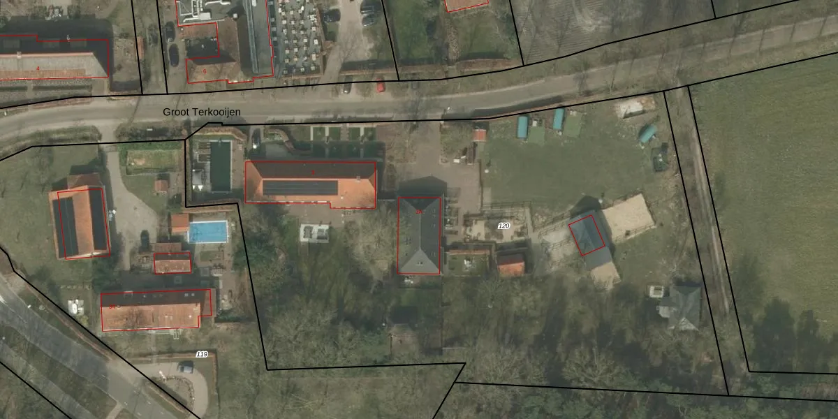 Het perceel waarop Groot Terkooijen 3-A staat heeft een oppervlakte van 6960 m². Dit is een zeer groot perceel. De perceeloppervlakte wordt geregistreerd door het Kadaster. Gedetailleerde informatie over de maten van dit perceel kunt u vinden in het rapport Kadastrale kaart met maatvoering van Groot Terkooijen 3-A.