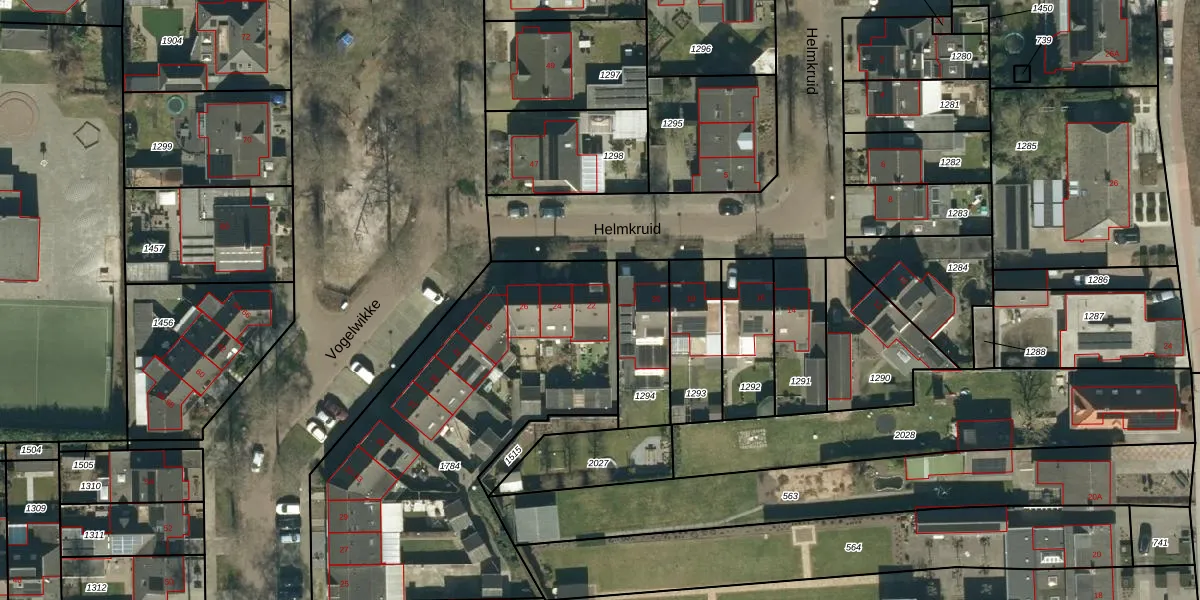 Het perceel waarop Helmkruid 22 staat heeft een oppervlakte van 1806 m². Dit is een zeer groot perceel. De perceeloppervlakte wordt geregistreerd door het Kadaster. Gedetailleerde informatie over de maten van dit perceel kunt u vinden in het rapport Kadastrale kaart met maatvoering van Helmkruid 22.