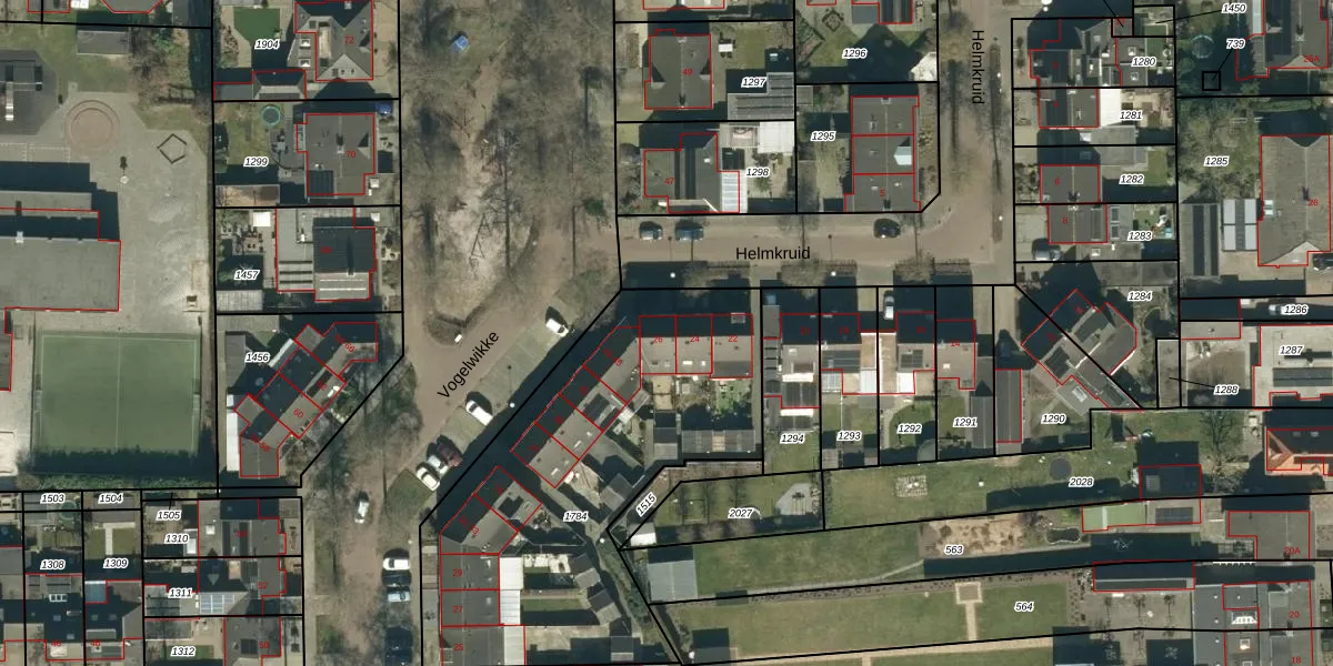 Het perceel waarop Helmkruid 26 staat heeft een oppervlakte van 1806 m². Dit is een zeer groot perceel. De perceeloppervlakte wordt geregistreerd door het Kadaster. Gedetailleerde informatie over de maten van dit perceel kunt u vinden in het rapport Kadastrale kaart met maatvoering van Helmkruid 26.