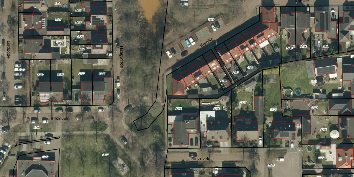 Het perceel waarop Kamille 38 staat heeft een oppervlakte van 1404 m². Dit is een zeer groot perceel. De perceeloppervlakte wordt geregistreerd door het Kadaster. Gedetailleerde informatie over de maten van dit perceel kunt u vinden in het rapport Kadastrale kaart met maatvoering van Kamille 38.