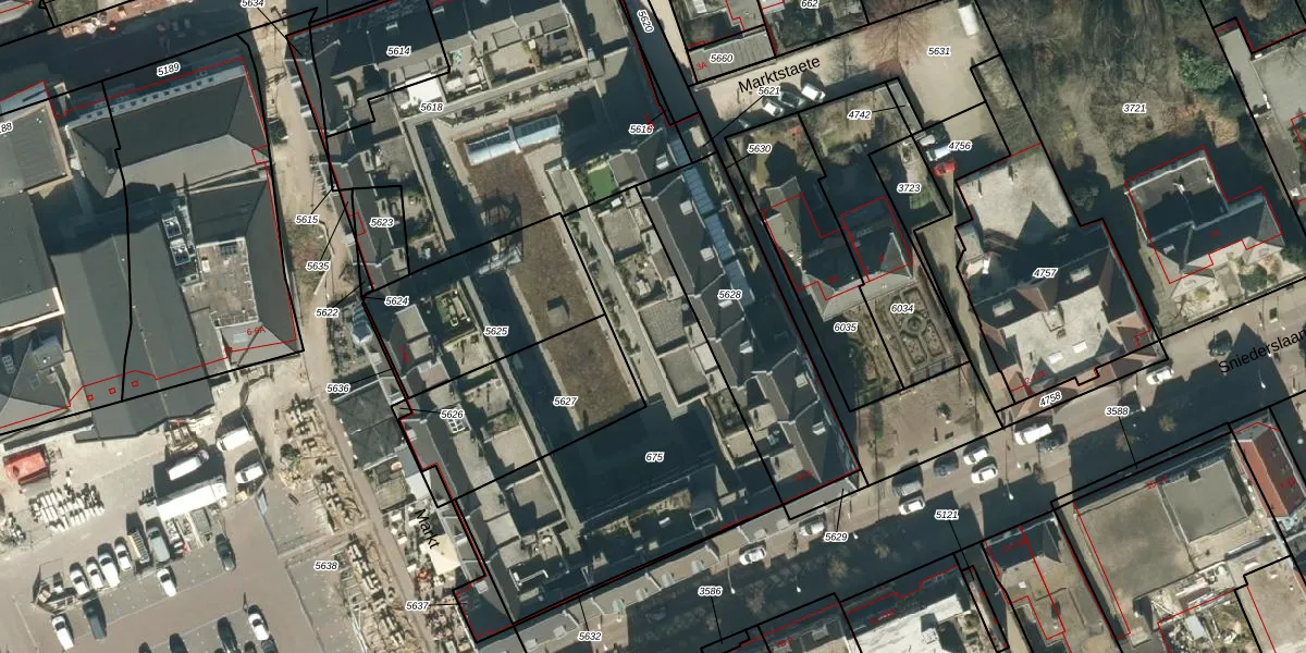 Het perceel waarop Marktstaete 31 staat heeft een oppervlakte van 1375 m². Dit is een zeer groot perceel. De perceeloppervlakte wordt geregistreerd door het Kadaster. Gedetailleerde informatie over de maten van dit perceel kunt u vinden in het rapport Kadastrale kaart met maatvoering van Marktstaete 31.