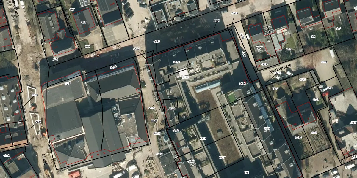Het perceel waarop Marktstaete 38 staat heeft een oppervlakte van 1567 m². Dit is een zeer groot perceel. De perceeloppervlakte wordt geregistreerd door het Kadaster. Gedetailleerde informatie over de maten van dit perceel kunt u vinden in het rapport Kadastrale kaart met maatvoering van Marktstaete 38.