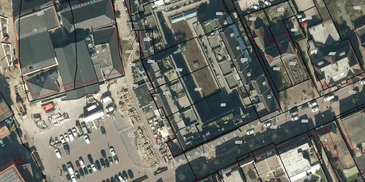 Het perceel waarop Marktstaete 52 staat heeft een oppervlakte van 562 m². Dit is een groot perceel. De perceeloppervlakte wordt geregistreerd door het Kadaster. Gedetailleerde informatie over de maten van dit perceel kunt u vinden in het rapport Kadastrale kaart met maatvoering van Marktstaete 52.