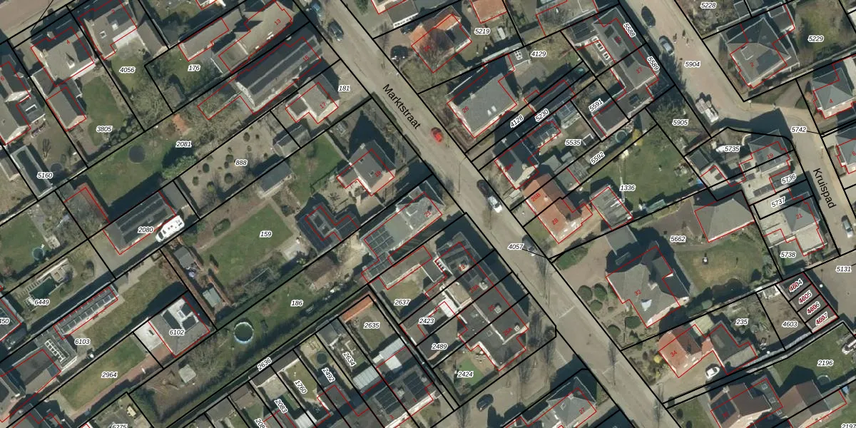 Het perceel waarop Marktstraat 21 staat heeft een oppervlakte van 1019 m². Dit is een zeer groot perceel. De perceeloppervlakte wordt geregistreerd door het Kadaster. Gedetailleerde informatie over de maten van dit perceel kunt u vinden in het rapport Kadastrale kaart met maatvoering van Marktstraat 21.