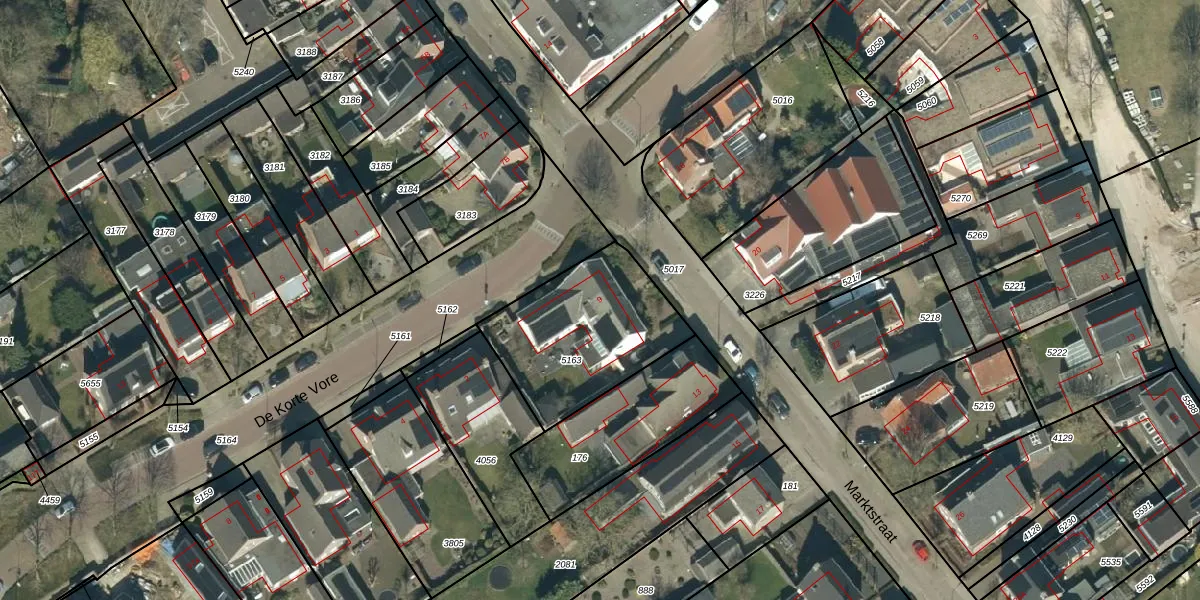 Het perceel waarop Marktstraat 9 staat heeft een oppervlakte van 605 m². Dit is een groot perceel. De perceeloppervlakte wordt geregistreerd door het Kadaster. Gedetailleerde informatie over de maten van dit perceel kunt u vinden in het rapport Kadastrale kaart met maatvoering van Marktstraat 9.
