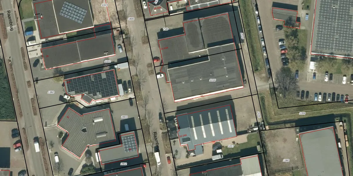 Het perceel waarop Raambrug 14-A staat heeft een oppervlakte van 1360 m². Dit is een zeer groot perceel. De perceeloppervlakte wordt geregistreerd door het Kadaster. Gedetailleerde informatie over de maten van dit perceel kunt u vinden in het rapport Kadastrale kaart met maatvoering van Raambrug 14-A.