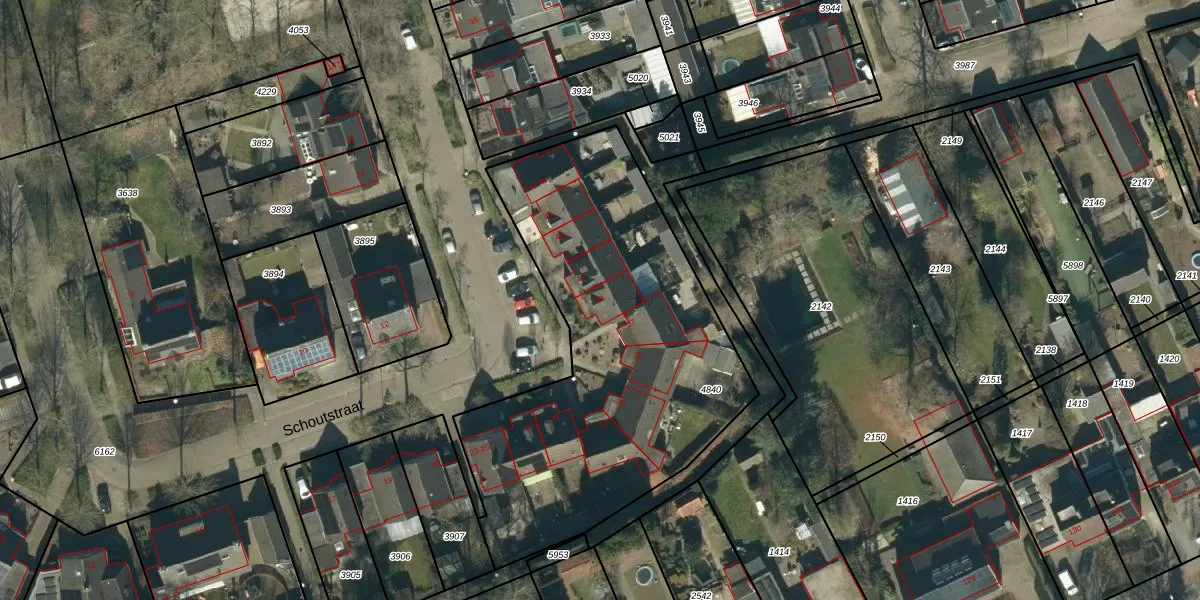 Het perceel waarop Schoutstraat 39 staat heeft een oppervlakte van 1956 m². Dit is een zeer groot perceel. De perceeloppervlakte wordt geregistreerd door het Kadaster. Gedetailleerde informatie over de maten van dit perceel kunt u vinden in het rapport Kadastrale kaart met maatvoering van Schoutstraat 39.
