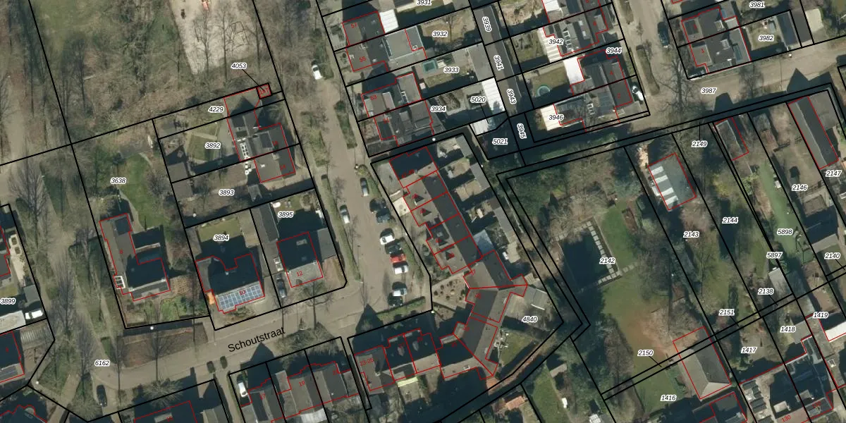 Het perceel waarop Schoutstraat 43 staat heeft een oppervlakte van 1956 m². Dit is een zeer groot perceel. De perceeloppervlakte wordt geregistreerd door het Kadaster. Gedetailleerde informatie over de maten van dit perceel kunt u vinden in het rapport Kadastrale kaart met maatvoering van Schoutstraat 43.