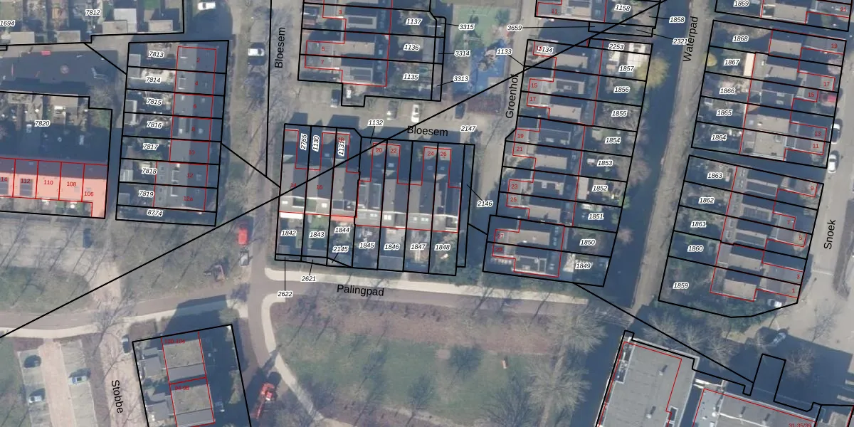 Het perceel waarop Bloesem 24 staat heeft een oppervlakte van 184 m². Dit is een middelgroot perceel. De perceeloppervlakte wordt geregistreerd door het Kadaster. Gedetailleerde informatie over de maten van dit perceel kunt u vinden in het rapport Kadastrale kaart met maatvoering van Bloesem 24.