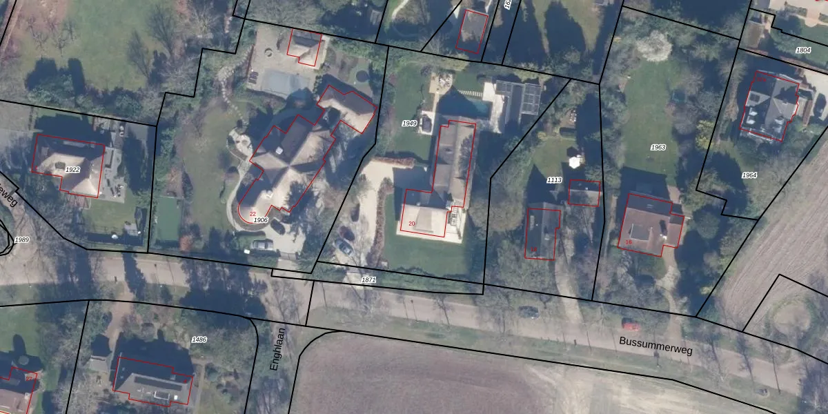 Het perceel waarop Bussummerweg 20 staat heeft een oppervlakte van 1940 m². Dit is een zeer groot perceel. De perceeloppervlakte wordt geregistreerd door het Kadaster. Gedetailleerde informatie over de maten van dit perceel kunt u vinden in het rapport Kadastrale kaart met maatvoering van Bussummerweg 20.