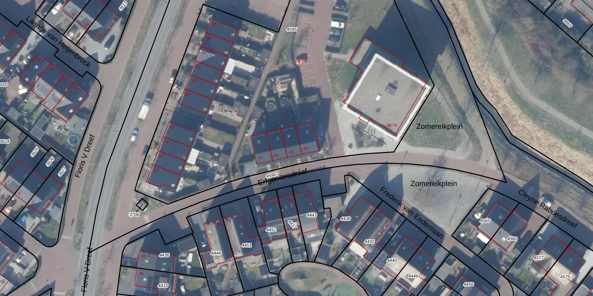 Erfgooiersdreef 45 is gelegen op kadastraal perceel BRC00C4595. Deze kadastrale aanduiding is uniek en wordt gebruikt door het Kadaster om eigendomsrechten en andere zakelijke rechten vast te leggen. Het perceel maakt onderdeel uit van de kadastrale gemeente Blaricum.