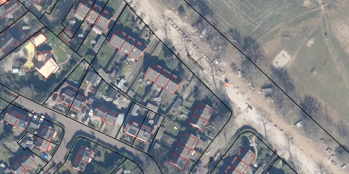 Het perceel waarop Meentzoom 35 staat heeft een oppervlakte van 3545 m². Dit is een zeer groot perceel. De perceeloppervlakte wordt geregistreerd door het Kadaster. Gedetailleerde informatie over de maten van dit perceel kunt u vinden in het rapport Kadastrale kaart met maatvoering van Meentzoom 35.