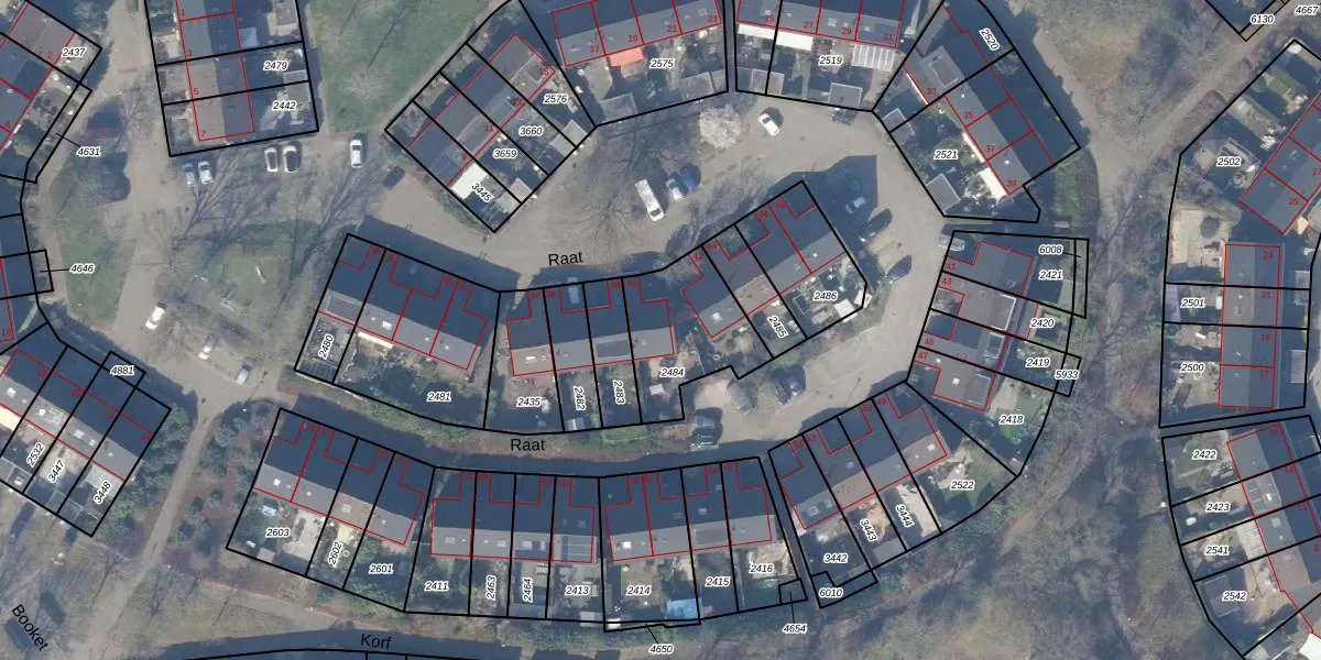 Het perceel waarop Raat 40 staat heeft een oppervlakte van 348 m². Dit is een groot perceel. De perceeloppervlakte wordt geregistreerd door het Kadaster. Gedetailleerde informatie over de maten van dit perceel kunt u vinden in het rapport Kadastrale kaart met maatvoering van Raat 40.