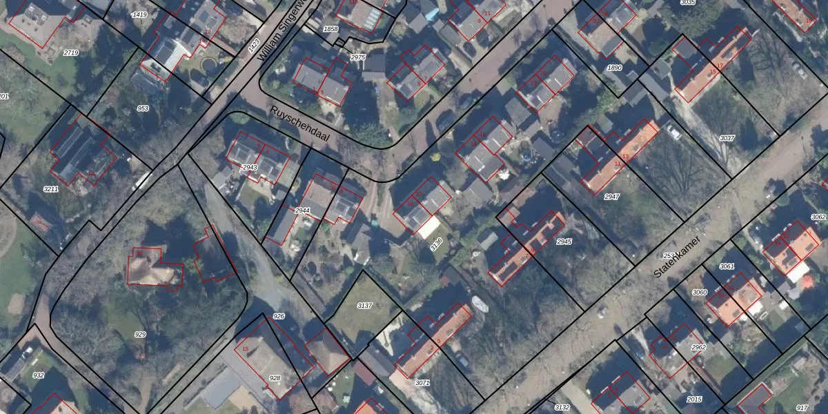 Het perceel waarop Ruyschendaal 10 staat heeft een oppervlakte van 3524 m². Dit is een zeer groot perceel. De perceeloppervlakte wordt geregistreerd door het Kadaster. Gedetailleerde informatie over de maten van dit perceel kunt u vinden in het rapport Kadastrale kaart met maatvoering van Ruyschendaal 10.
