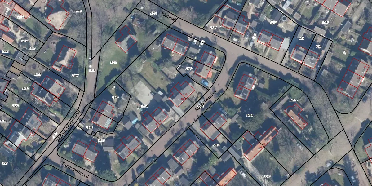 Het perceel waarop Ruyschendaal 15 staat heeft een oppervlakte van 2849 m². Dit is een zeer groot perceel. De perceeloppervlakte wordt geregistreerd door het Kadaster. Gedetailleerde informatie over de maten van dit perceel kunt u vinden in het rapport Kadastrale kaart met maatvoering van Ruyschendaal 15.