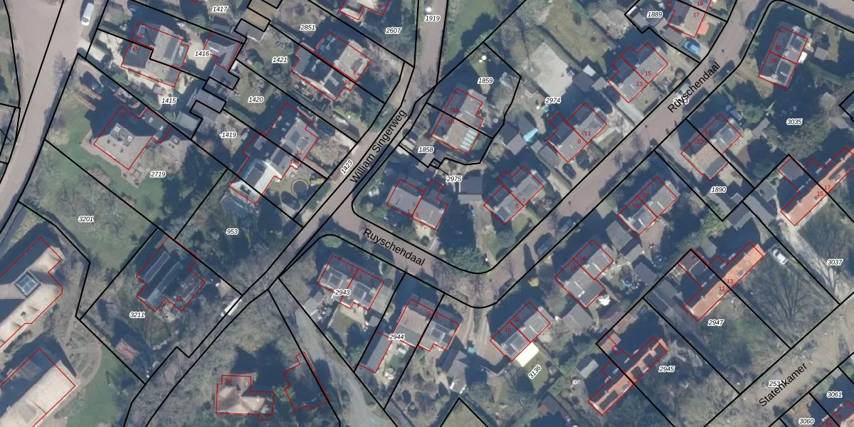 Het perceel waarop Ruyschendaal 3 staat heeft een oppervlakte van 2849 m². Dit is een zeer groot perceel. De perceeloppervlakte wordt geregistreerd door het Kadaster. Gedetailleerde informatie over de maten van dit perceel kunt u vinden in het rapport Kadastrale kaart met maatvoering van Ruyschendaal 3.