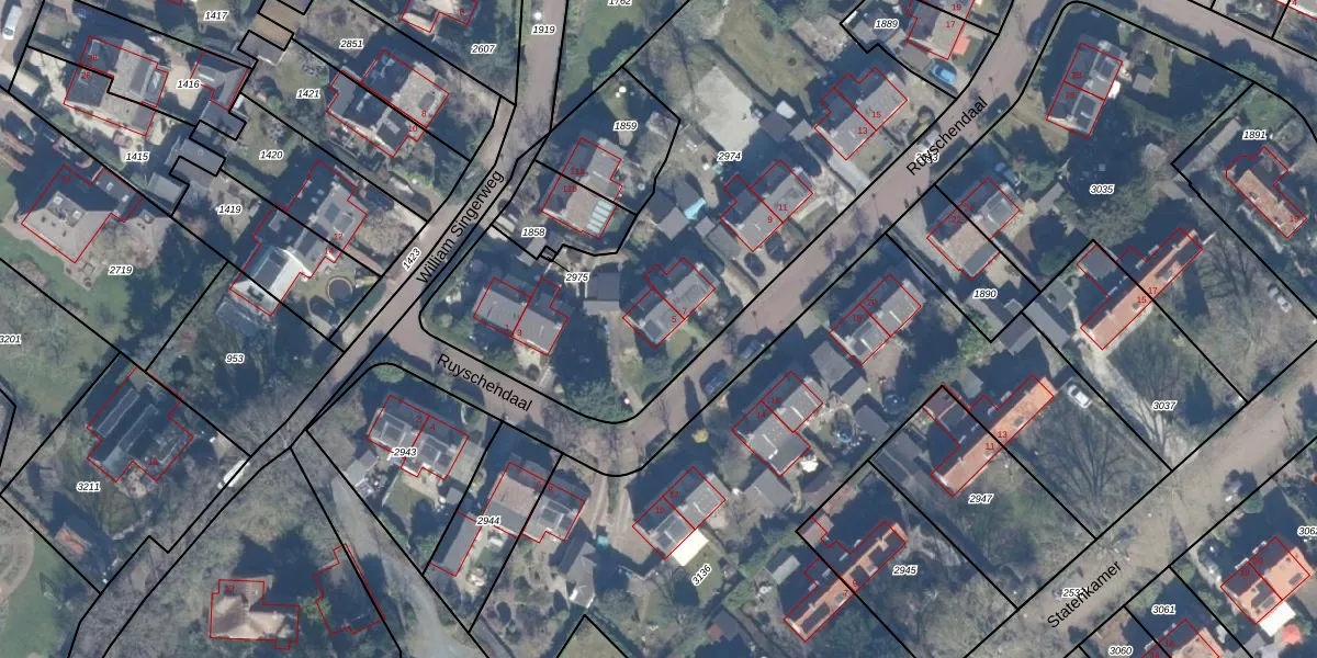 Het perceel waarop Ruyschendaal 5 staat heeft een oppervlakte van 2849 m². Dit is een zeer groot perceel. De perceeloppervlakte wordt geregistreerd door het Kadaster. Gedetailleerde informatie over de maten van dit perceel kunt u vinden in het rapport Kadastrale kaart met maatvoering van Ruyschendaal 5.