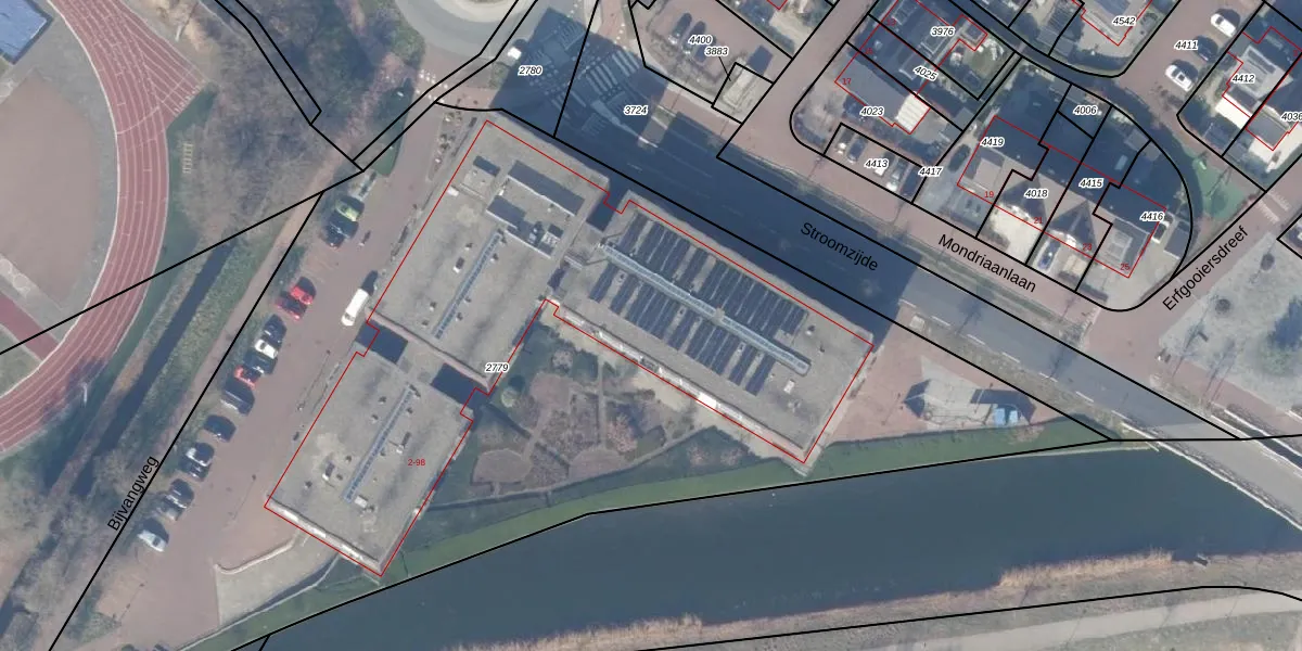 Het perceel waarop Stroomzijde 10-c staat heeft een oppervlakte van 6606 m². Dit is een zeer groot perceel. De perceeloppervlakte wordt geregistreerd door het Kadaster. Gedetailleerde informatie over de maten van dit perceel kunt u vinden in het rapport Kadastrale kaart met maatvoering van Stroomzijde 10-c.