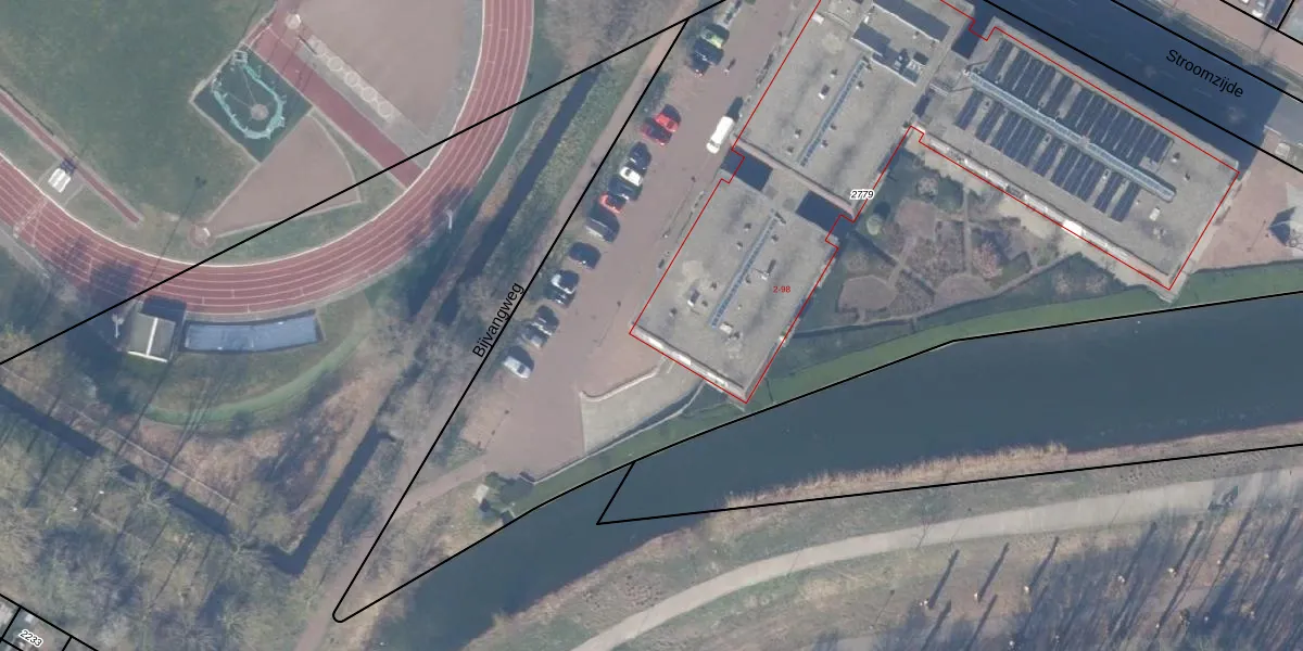 Het perceel waarop Stroomzijde 2 staat heeft een oppervlakte van 6606 m². Dit is een zeer groot perceel. De perceeloppervlakte wordt geregistreerd door het Kadaster. Gedetailleerde informatie over de maten van dit perceel kunt u vinden in het rapport Kadastrale kaart met maatvoering van Stroomzijde 2.