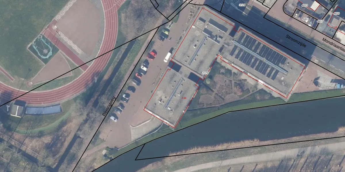 Het perceel waarop Stroomzijde 20 staat heeft een oppervlakte van 6606 m². Dit is een zeer groot perceel. De perceeloppervlakte wordt geregistreerd door het Kadaster. Gedetailleerde informatie over de maten van dit perceel kunt u vinden in het rapport Kadastrale kaart met maatvoering van Stroomzijde 20.