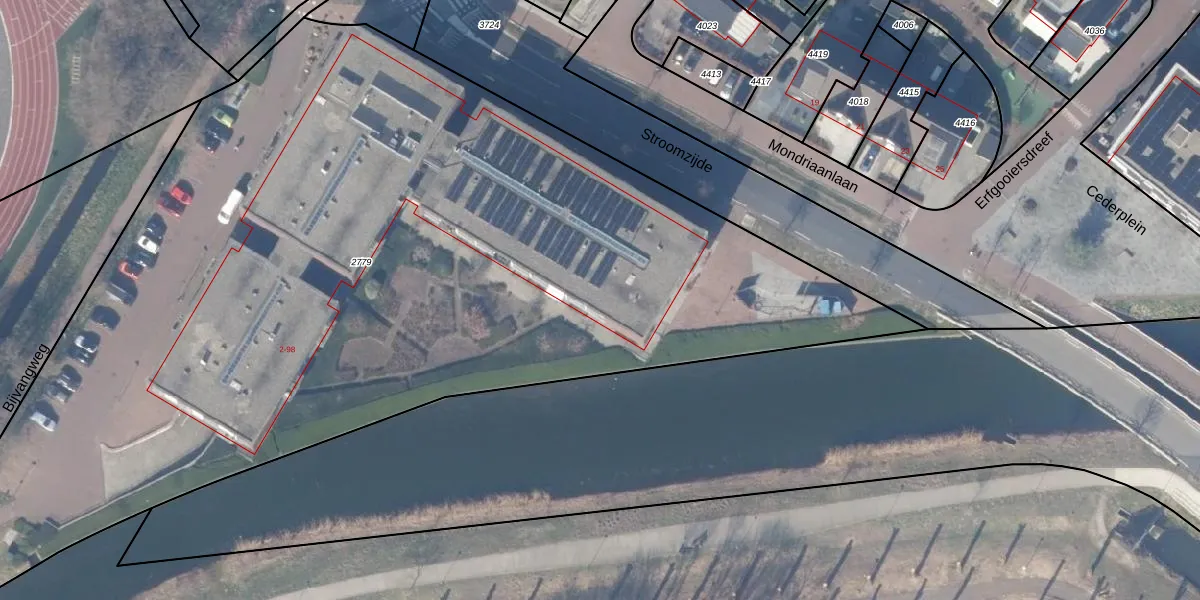 Het perceel waarop Stroomzijde 38 staat heeft een oppervlakte van 6606 m². Dit is een zeer groot perceel. De perceeloppervlakte wordt geregistreerd door het Kadaster. Gedetailleerde informatie over de maten van dit perceel kunt u vinden in het rapport Kadastrale kaart met maatvoering van Stroomzijde 38.