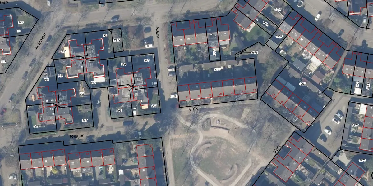 Het perceel waarop Valk 32 staat heeft een oppervlakte van 1868 m². Dit is een zeer groot perceel. De perceeloppervlakte wordt geregistreerd door het Kadaster. Gedetailleerde informatie over de maten van dit perceel kunt u vinden in het rapport Kadastrale kaart met maatvoering van Valk 32.