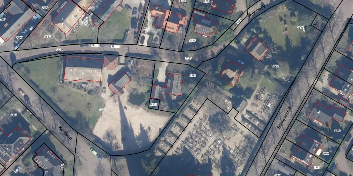 Het perceel waarop Venenweg 2-a staat heeft een oppervlakte van 595 m². Dit is een groot perceel. De perceeloppervlakte wordt geregistreerd door het Kadaster. Gedetailleerde informatie over de maten van dit perceel kunt u vinden in het rapport Kadastrale kaart met maatvoering van Venenweg 2-a.