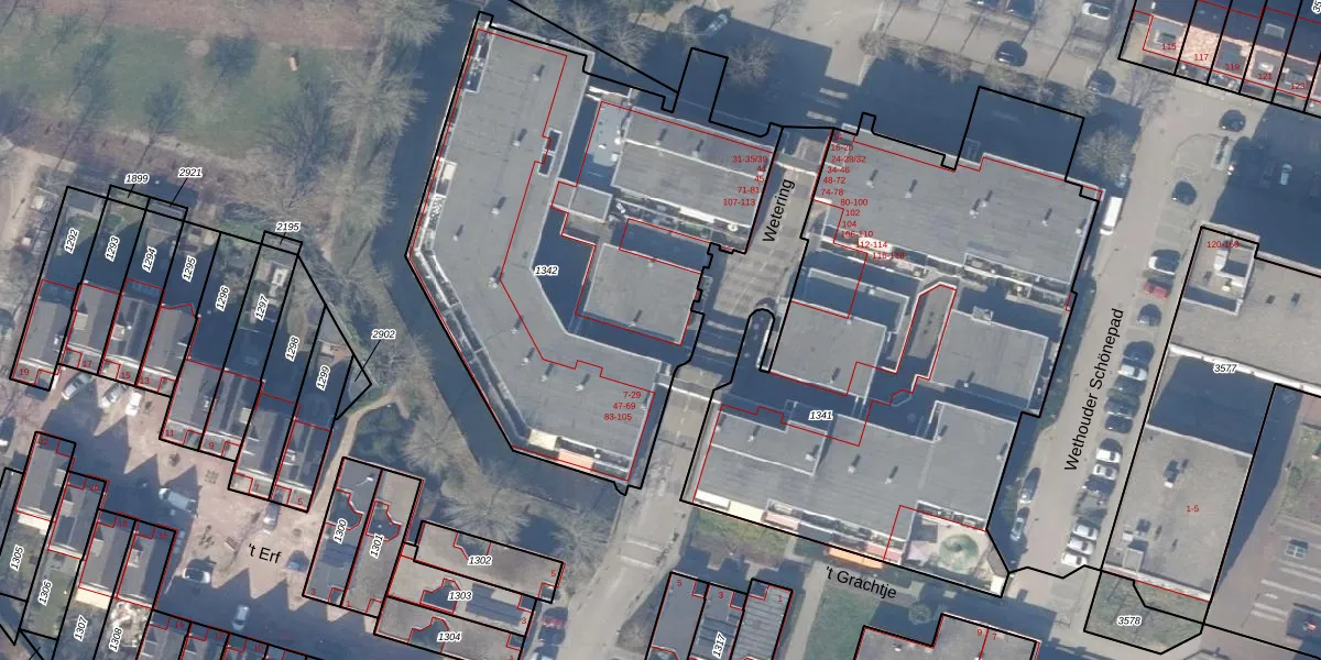 Het perceel waarop Wetering 45 staat heeft een oppervlakte van 2495 m². Dit is een zeer groot perceel. De perceeloppervlakte wordt geregistreerd door het Kadaster. Gedetailleerde informatie over de maten van dit perceel kunt u vinden in het rapport Kadastrale kaart met maatvoering van Wetering 45.