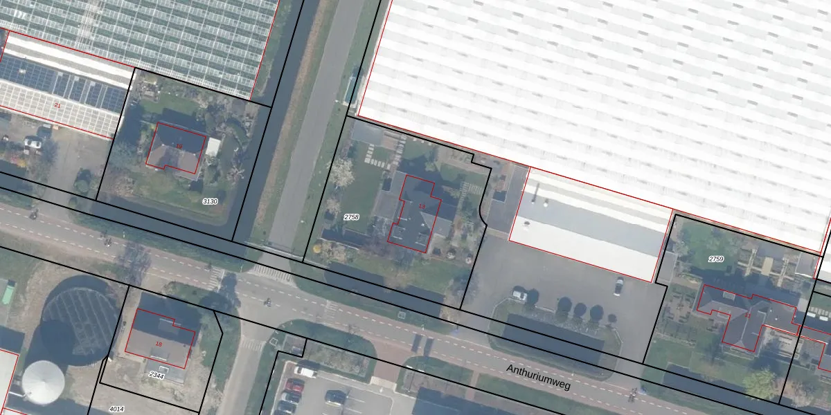 Anthuriumweg 13 is gelegen op kadastraal perceel BWK02D2758. Deze kadastrale aanduiding is uniek en wordt gebruikt door het Kadaster om eigendomsrechten en andere zakelijke rechten vast te leggen. Het perceel maakt onderdeel uit van de kadastrale gemeente Bleiswijk.
