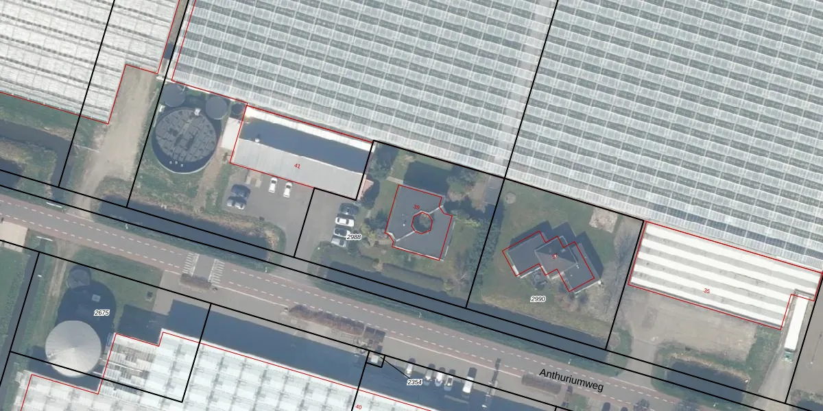 Anthuriumweg 39 is gelegen op kadastraal perceel BWK02D2988. Deze kadastrale aanduiding is uniek en wordt gebruikt door het Kadaster om eigendomsrechten en andere zakelijke rechten vast te leggen. Het perceel maakt onderdeel uit van de kadastrale gemeente Bleiswijk.
