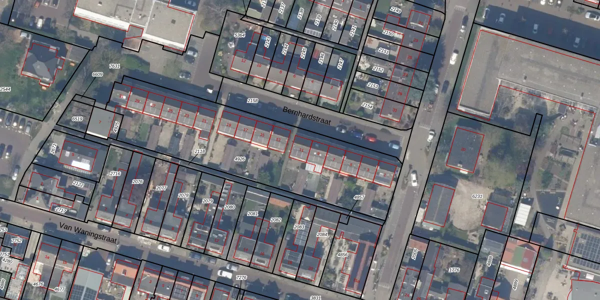 Het perceel waarop Bernhardstraat 11 staat heeft een oppervlakte van 2082 m². Dit is een zeer groot perceel. De perceeloppervlakte wordt geregistreerd door het Kadaster. Gedetailleerde informatie over de maten van dit perceel kunt u vinden in het rapport Kadastrale kaart met maatvoering van Bernhardstraat 11.