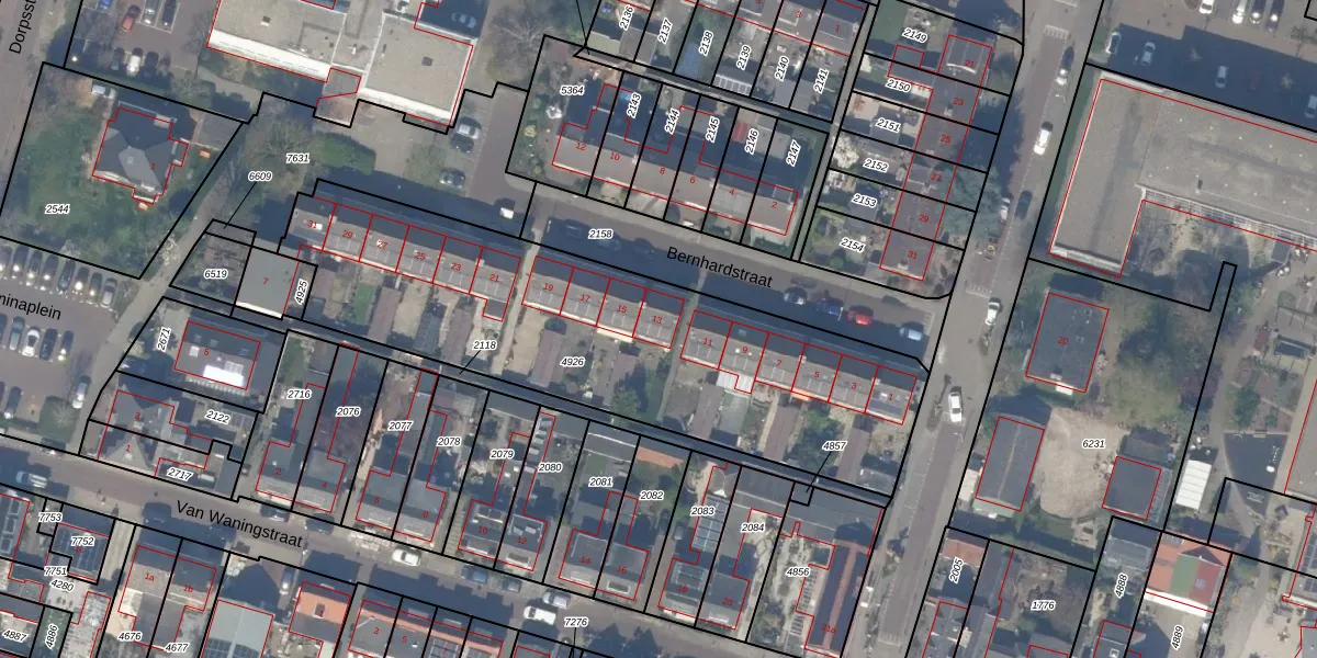 Het perceel waarop Bernhardstraat 13 staat heeft een oppervlakte van 2082 m². Dit is een zeer groot perceel. De perceeloppervlakte wordt geregistreerd door het Kadaster. Gedetailleerde informatie over de maten van dit perceel kunt u vinden in het rapport Kadastrale kaart met maatvoering van Bernhardstraat 13.