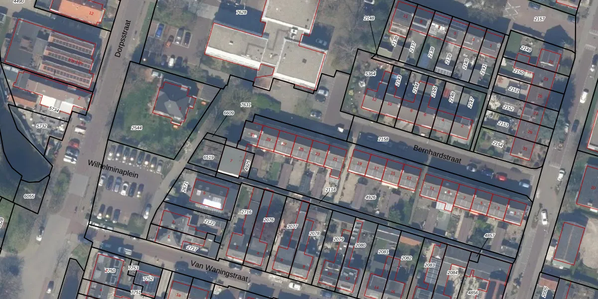 Het perceel waarop Bernhardstraat 25 staat heeft een oppervlakte van 2082 m². Dit is een zeer groot perceel. De perceeloppervlakte wordt geregistreerd door het Kadaster. Gedetailleerde informatie over de maten van dit perceel kunt u vinden in het rapport Kadastrale kaart met maatvoering van Bernhardstraat 25.