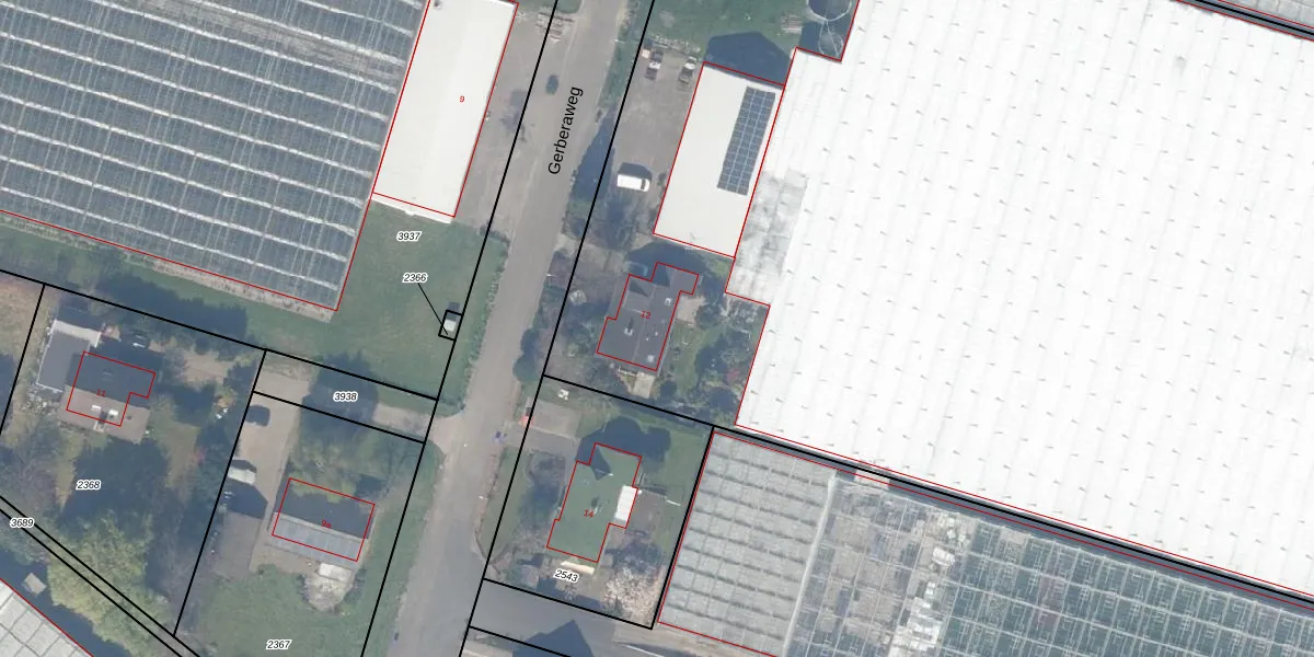 Het perceel waarop Gerberaweg 12 staat heeft een oppervlakte van 2,1 ha. Dit is een zeer groot perceel. De perceeloppervlakte wordt geregistreerd door het Kadaster. Gedetailleerde informatie over de maten van dit perceel kunt u vinden in het rapport Kadastrale kaart met maatvoering van Gerberaweg 12.
