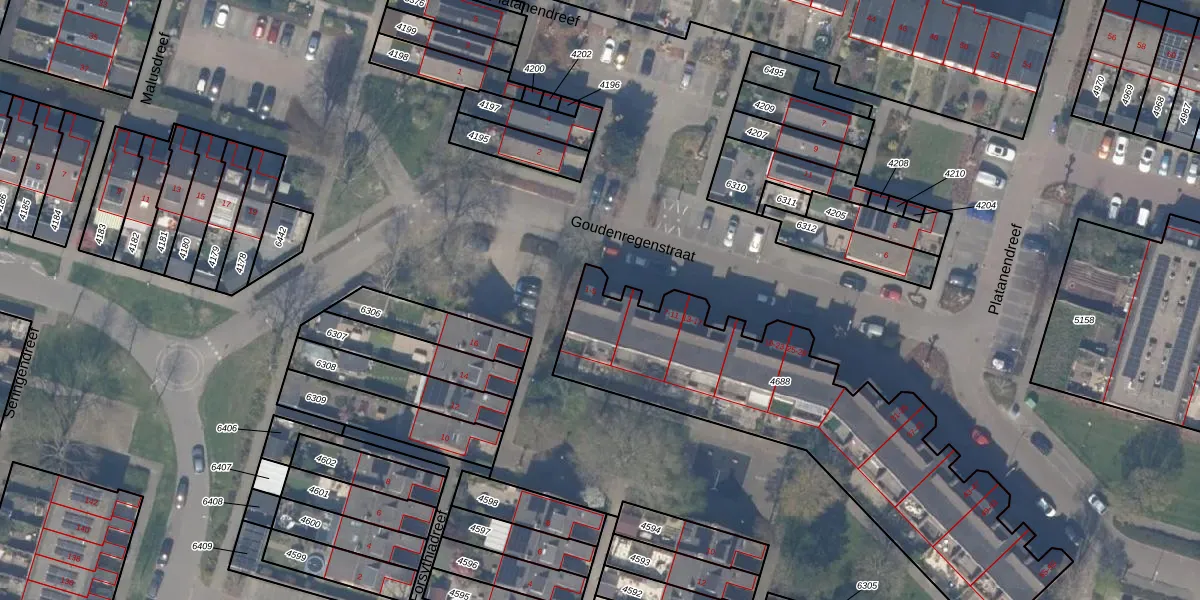 Het perceel waarop Goudenregenstraat 5 staat heeft een oppervlakte van 1537 m². Dit is een zeer groot perceel. De perceeloppervlakte wordt geregistreerd door het Kadaster. Gedetailleerde informatie over de maten van dit perceel kunt u vinden in het rapport Kadastrale kaart met maatvoering van Goudenregenstraat 5.