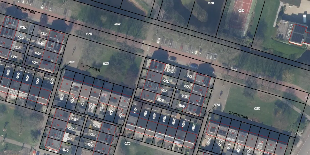 Het perceel waarop Gruttostraat 57 staat heeft een oppervlakte van 155 m². Dit is een middelgroot perceel. De perceeloppervlakte wordt geregistreerd door het Kadaster. Gedetailleerde informatie over de maten van dit perceel kunt u vinden in het rapport Kadastrale kaart met maatvoering van Gruttostraat 57.