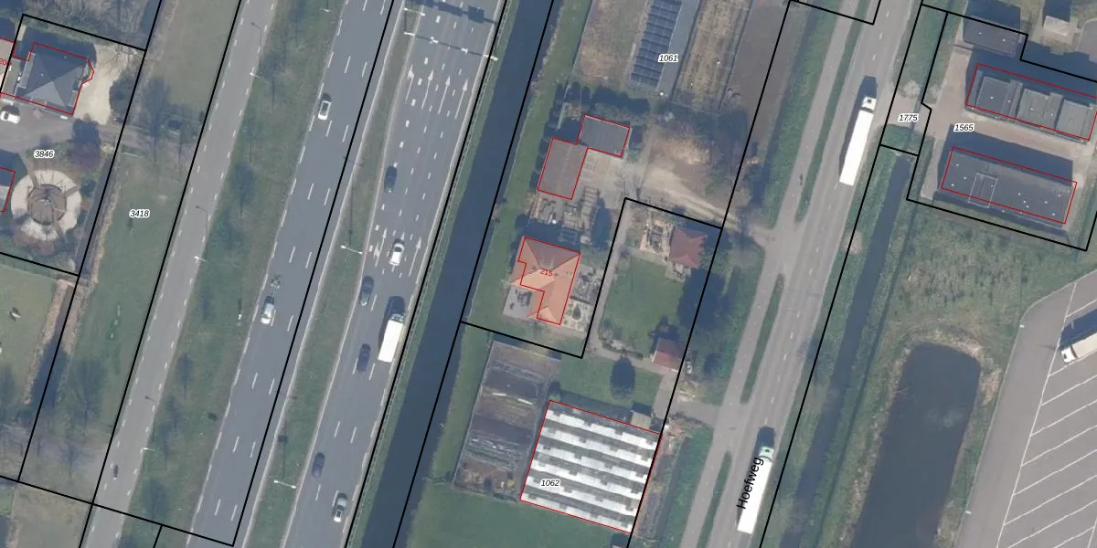 Het perceel waarop Hoefweg 215 staat heeft een oppervlakte van 2455 m². Dit is een zeer groot perceel. De perceeloppervlakte wordt geregistreerd door het Kadaster. Gedetailleerde informatie over de maten van dit perceel kunt u vinden in het rapport Kadastrale kaart met maatvoering van Hoefweg 215.