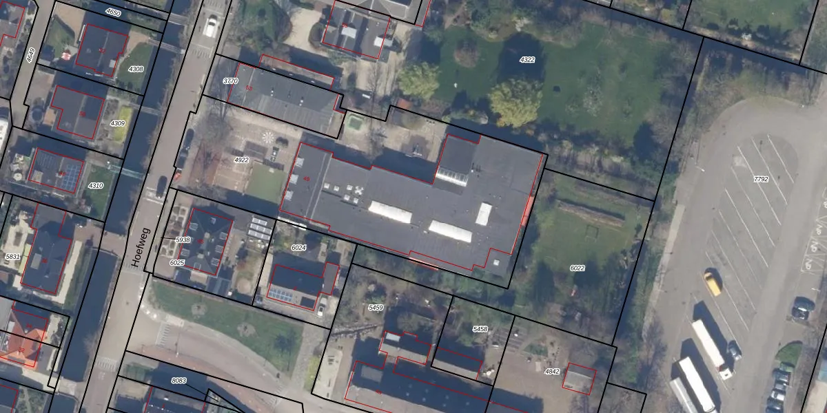 Het perceel waarop Hoefweg 49 staat heeft een oppervlakte van 2519 m². Dit is een zeer groot perceel. De perceeloppervlakte wordt geregistreerd door het Kadaster. Gedetailleerde informatie over de maten van dit perceel kunt u vinden in het rapport Kadastrale kaart met maatvoering van Hoefweg 49.