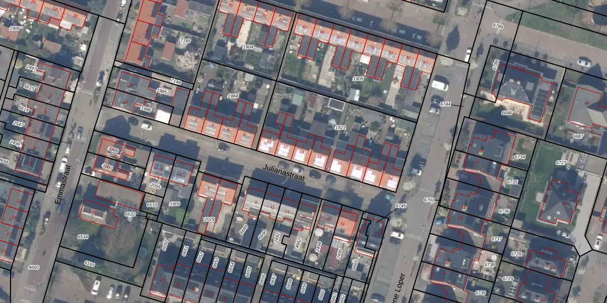 Julianastraat 14 is gelegen op kadastraal perceel BWK02C1921. Deze kadastrale aanduiding is uniek en wordt gebruikt door het Kadaster om eigendomsrechten en andere zakelijke rechten vast te leggen. Het perceel maakt onderdeel uit van de kadastrale gemeente Bleiswijk.