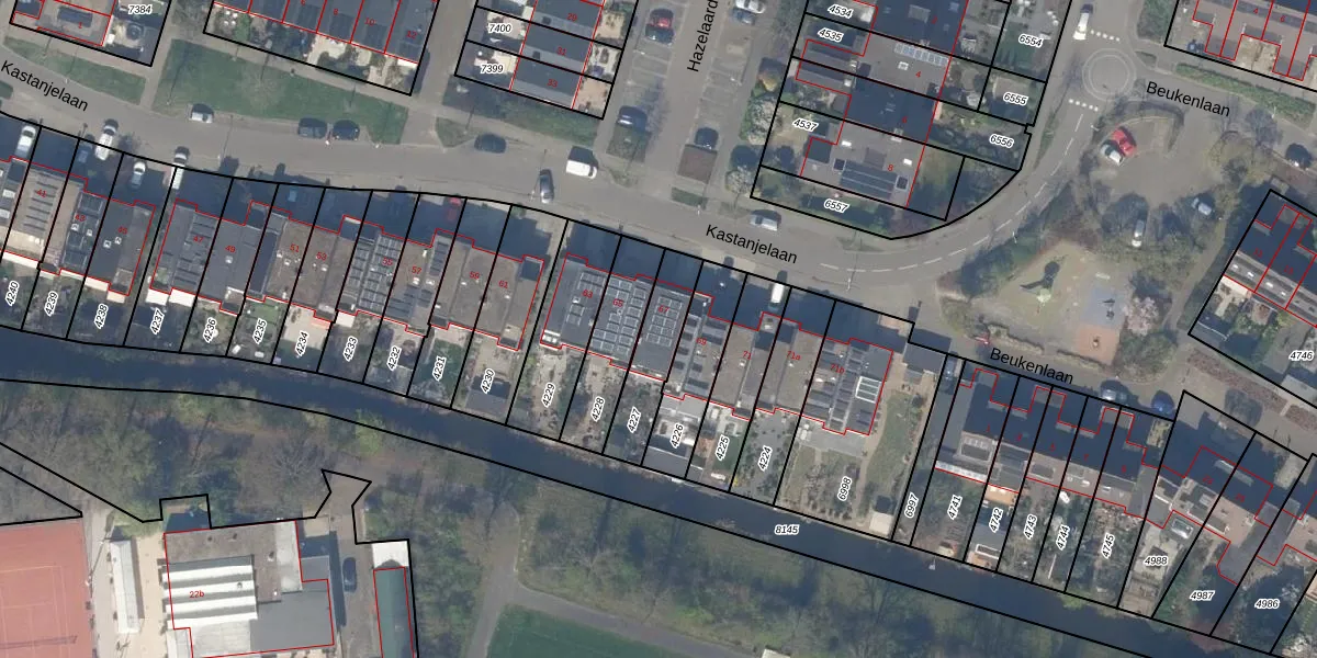 Het perceel waarop Kastanjelaan 67 staat heeft een oppervlakte van 197 m². Dit is een middelgroot perceel. De perceeloppervlakte wordt geregistreerd door het Kadaster. Gedetailleerde informatie over de maten van dit perceel kunt u vinden in het rapport Kadastrale kaart met maatvoering van Kastanjelaan 67.