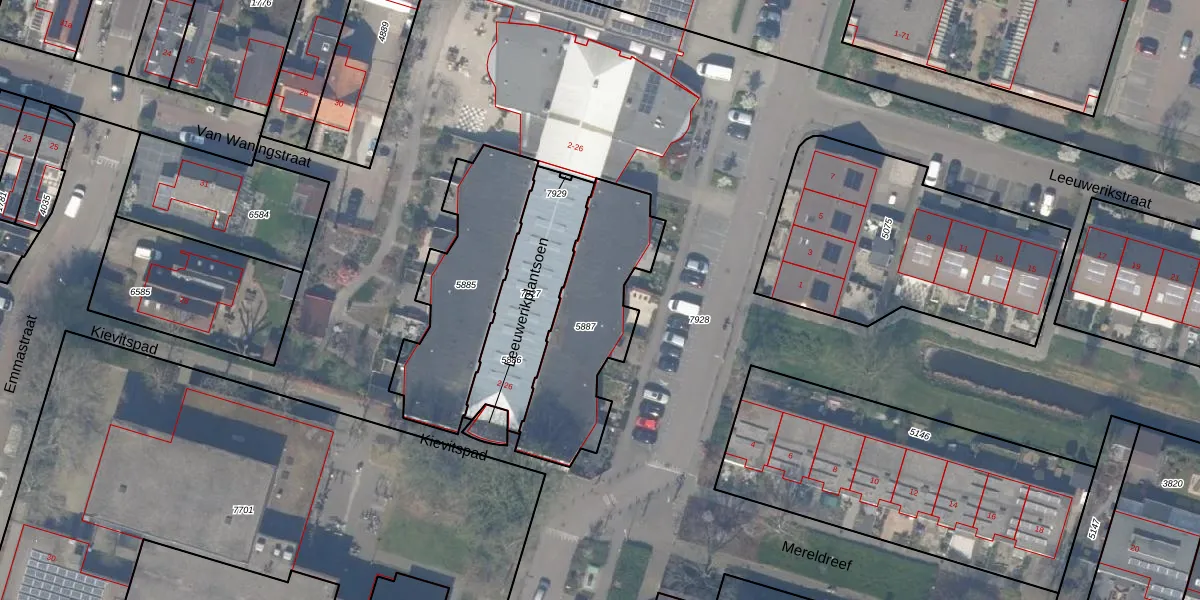 Het perceel waarop Leeuwerikstraat 8 staat heeft een oppervlakte van 565 m². Dit is een groot perceel. De perceeloppervlakte wordt geregistreerd door het Kadaster. Gedetailleerde informatie over de maten van dit perceel kunt u vinden in het rapport Kadastrale kaart met maatvoering van Leeuwerikstraat 8.