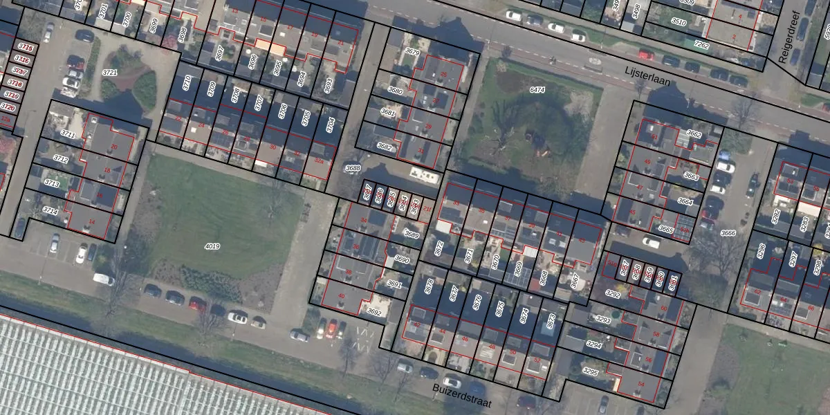Het perceel waarop Lijsterlaan 21-e staat heeft een oppervlakte van 18 m². Dit is een klein perceel. De perceeloppervlakte wordt geregistreerd door het Kadaster. Gedetailleerde informatie over de maten van dit perceel kunt u vinden in het rapport Kadastrale kaart met maatvoering van Lijsterlaan 21-e.