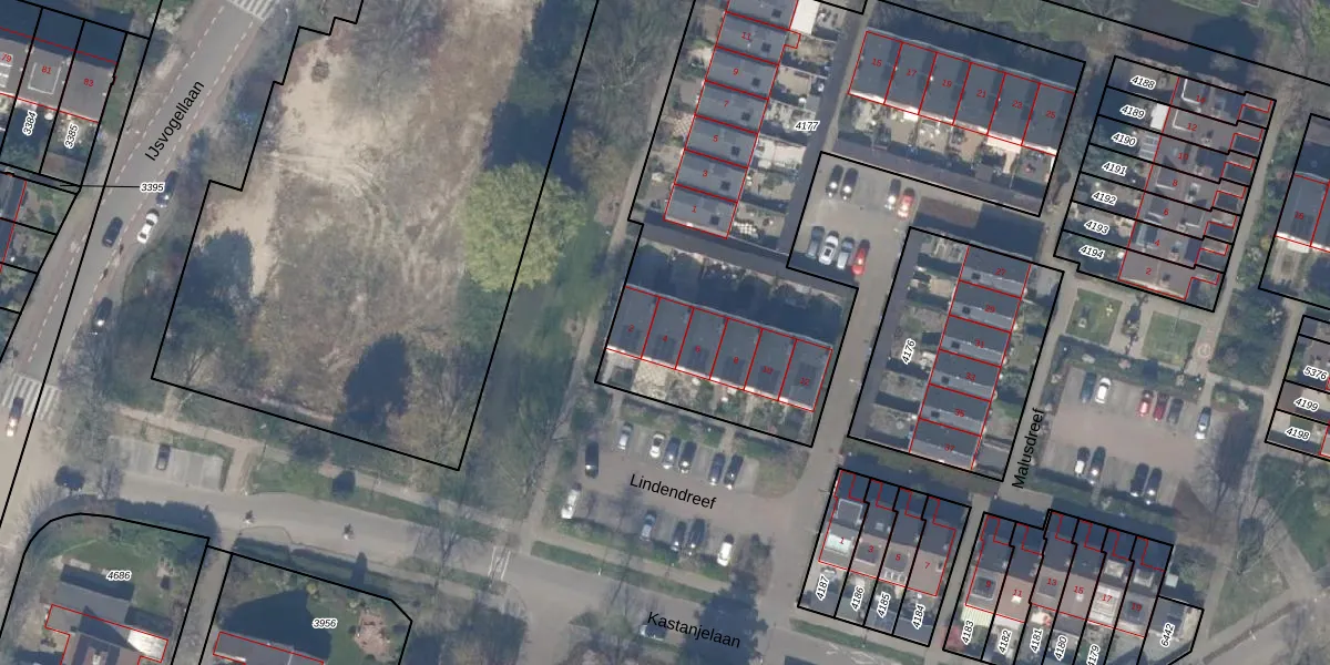 Het perceel waarop Lindendreef 4 staat heeft een oppervlakte van 2644 m². Dit is een zeer groot perceel. De perceeloppervlakte wordt geregistreerd door het Kadaster. Gedetailleerde informatie over de maten van dit perceel kunt u vinden in het rapport Kadastrale kaart met maatvoering van Lindendreef 4.