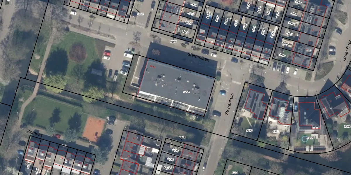 Het perceel waarop Sterrenlaan 45 staat heeft een oppervlakte van 1116 m². Dit is een zeer groot perceel. De perceeloppervlakte wordt geregistreerd door het Kadaster. Gedetailleerde informatie over de maten van dit perceel kunt u vinden in het rapport Kadastrale kaart met maatvoering van Sterrenlaan 45.