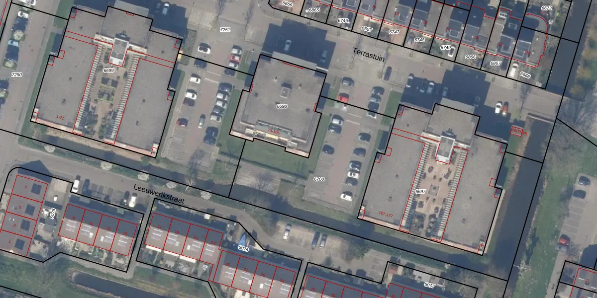 Terrastuin 105 is gelegen op kadastraal perceel BWK02C6698. Deze kadastrale aanduiding is uniek en wordt gebruikt door het Kadaster om eigendomsrechten en andere zakelijke rechten vast te leggen. Het perceel maakt onderdeel uit van de kadastrale gemeente Bleiswijk.