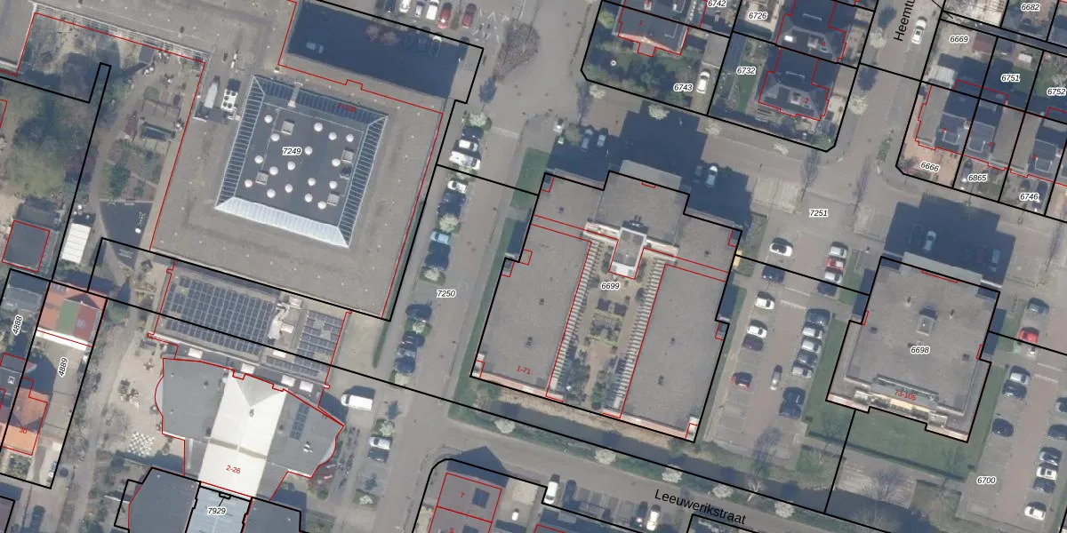 Het perceel waarop het adres ligt is BWK02-C-6699. De afkorting 'BWK02' staat voor kadastrale gemeente Bleiswijk. De gemiddelde perceelgrootte in Bleiswijk is 3194,54 m². Dit perceel is kleiner: de perceeloppervlakte bedraagt 1739 m². Het kleinste perceel in de kadastrale gemeente is 0 m² groot. De grootste perceeloppervlakte is 44,5 ha. Op het perceel liggen in totaal 36 adressen. In de Basisregistratie Kadaster (BRK) werden de grenzen van het perceel geregistreerd op 05-01-2010.