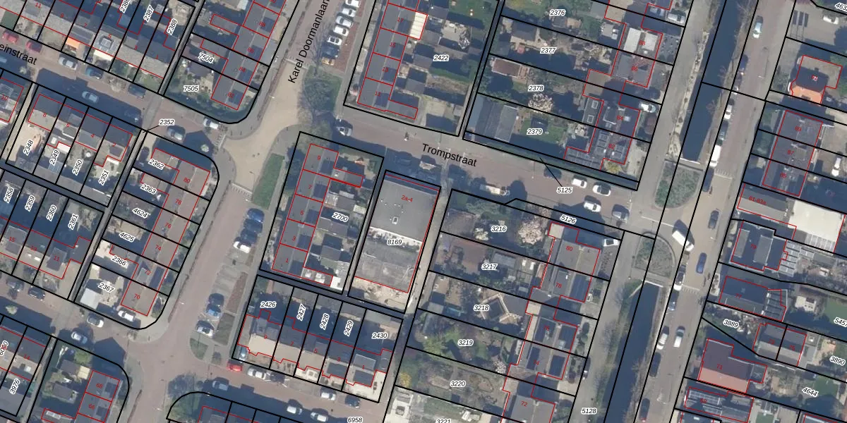 Het perceel waarop Trompstraat 2-c staat heeft een oppervlakte van 435 m². Dit is een groot perceel. De perceeloppervlakte wordt geregistreerd door het Kadaster. Gedetailleerde informatie over de maten van dit perceel kunt u vinden in het rapport Kadastrale kaart met maatvoering van Trompstraat 2-c.