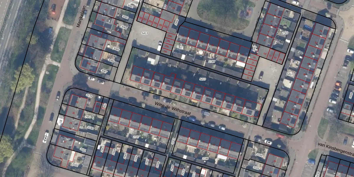 Het perceel waarop Witte de Withstraat 15 staat heeft een oppervlakte van 1732 m². Dit is een zeer groot perceel. De perceeloppervlakte wordt geregistreerd door het Kadaster. Gedetailleerde informatie over de maten van dit perceel kunt u vinden in het rapport Kadastrale kaart met maatvoering van Witte de Withstraat 15.